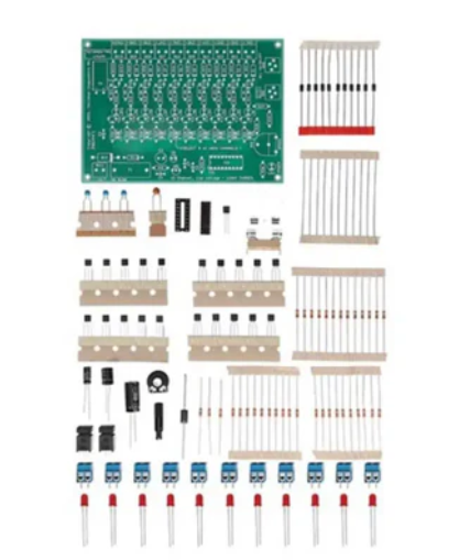 The 10 Channel Light Effect Generator Board Soldering Kit features 10 pre-programmed light modes, selectable via buttons. The kit provides 10 12V/400mA outputs for controlling cold cathode fluorescent tubes, bulbs, LEDs and "solid-state" relays.