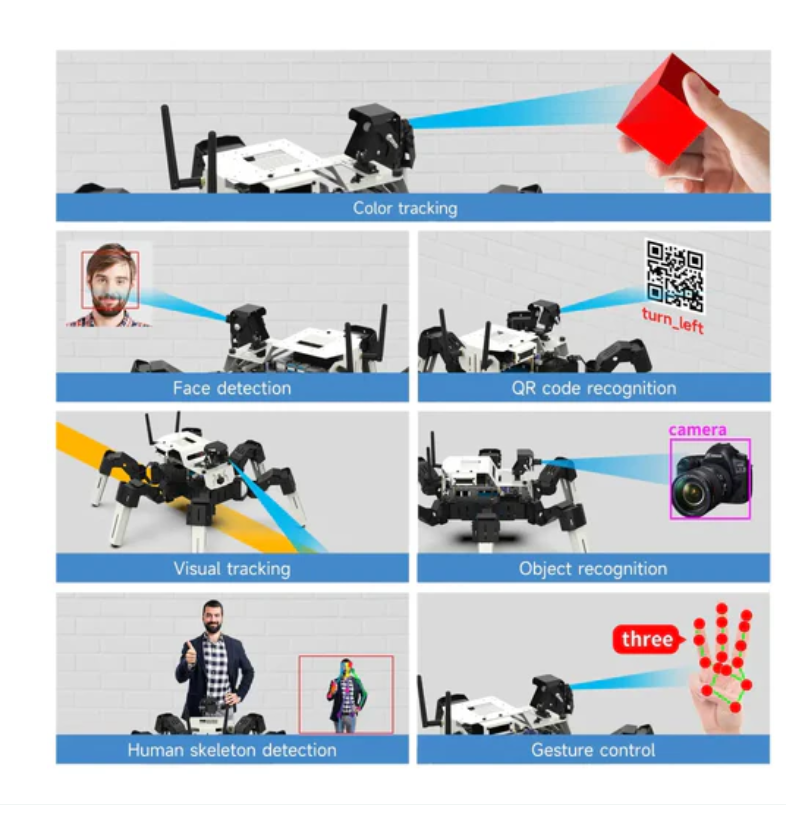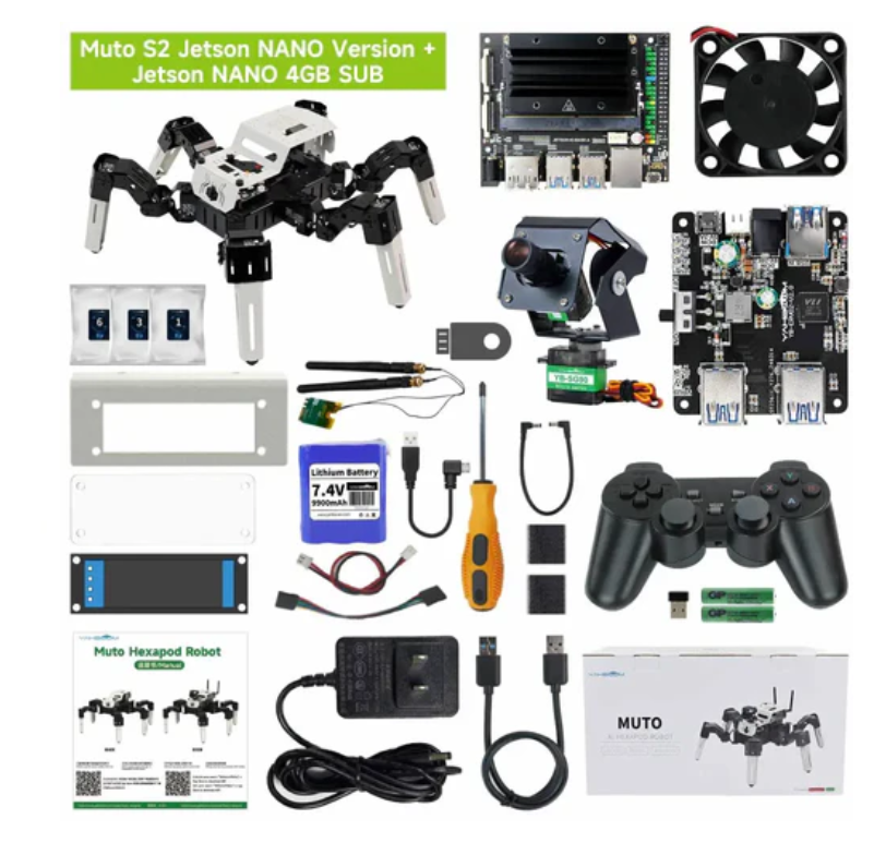 Muto is a desktop level biomimetic hexapod robot with an aluminum alloy body, 18PCS 35KG metal servos, and exquisite structural design that enables it to perform various simulated actions with astonishing flexibility and diversity. With the help of Raspberry Pi or Jetson Nano as the main controller, Muto can complete various functions such as color recognition, following, face tracking, QR code recognition, visual inspection, etc. through Python 3 programming. Users can control it through a mobile app, wireless controller, and computer web buttons, which can transmit real-time videos captured by the camera to their phone. Muto robots are an ideal companion for exploring technology, engineering, and programming.