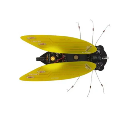 The Electronic Semi-Soldering Kit allows you to create a semi-formed robot using only three PCBs. Its body is matte black and its wings are shiny yellow with gold traces. Using the included parts, you can add legs to a cicada, thus creating a robot that looks like a cicada.