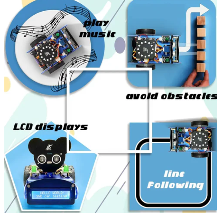 • Users can explore various features, including smartphone controlled robots compatible with Android devices and infrared remote-controlled robots. This kit is equipped with features such as obstacle avoidance, line tracking, LCD display screen, and light show. It comes with detailed tutorials, including step-by-step instructions, circuit schematics, and source code, to guide users through the assembly and programming process.