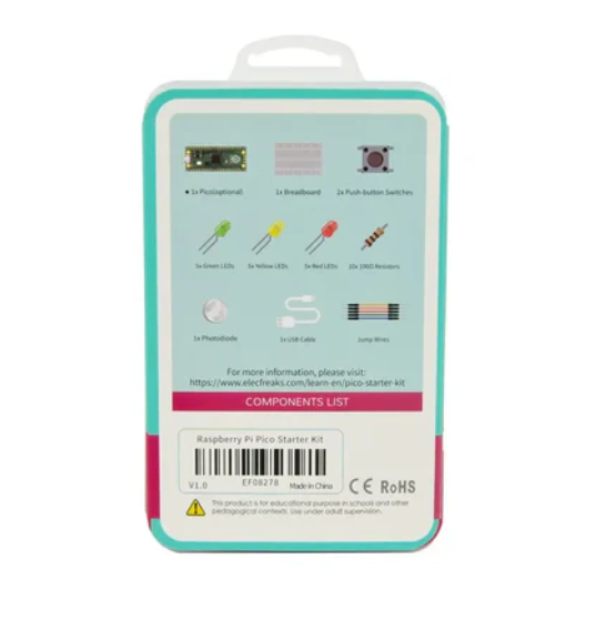 The ELECFREAKS Raspberry Pi Pico Starter Kit (Raspberry Pi Pico board not included) is an electronics starter kit designed for Raspberry Pi. The kit contains basic electronic components such as light emitting diodes (LEDs), buttons, photodiodes, etc., allowing you to easily step into the fascinating world of electronics. Also includes a breadboard, push button switches, green/yellow/red LEDs, resistors, photodiodes, USB cables, and various jumper wires.