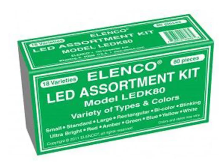 • The Elenco LED Combo Kit LEDK80 offers a wide variety of LEDs for a variety of applications. This comprehensive kit includes LEDs in a variety of sizes, from small to large, and shapes including standard and rectangular. The combo features a variety of colors including red, amber, green, blue, yellow, and white. In addition, the kit also offers specialty LEDs including bi-color, flashing, and super bright options. Each of these components is carefully organized within a cardboard box designed to facilitate storage and selection for any project.