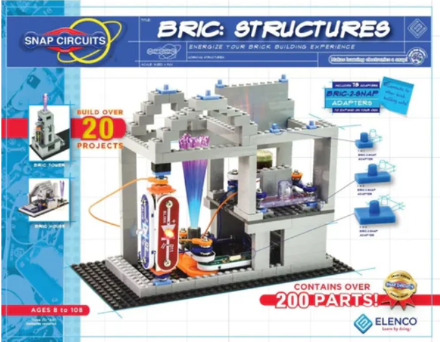 • The Elenco Snap Circuits Bric Kit - Structures lets your child use their imagination to combine SNAP CIRCUITS with regular bricks to create endless combinations of structures and circuits. With patent-pending Bric-2-Snap technology, kids can connect their bricks with SNAP CIRCUITS lights, sounds, moving parts and 3-D circuits to invent and animate nearly anything!