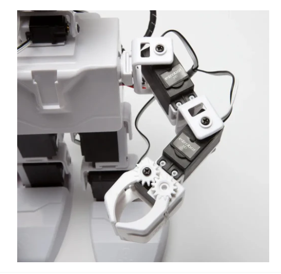 EZ-Robot JD Humanoid is a fully functional humanoid robot built using EZ-Bit. This humanoid robot has 16 degrees of freedom and is equipped with 16 strong metal gear servos. The head of the robot has a built-in camera that enables visual tracking modes such as color, motion, fonts, QR codes, faces, etc. The eyes of the robot have 18 LEDs (9 for each eye). Each LED can be configured to produce up to 1 million color combinations. The small clamp is driven by a powerful metal gear servo motor. JD has released an app that lets the robot walk right away. It includes a high-performance digital servo motor with a capacity of 15 kg/cm2. The metal gears and ball bearings inside can withstand high loads.