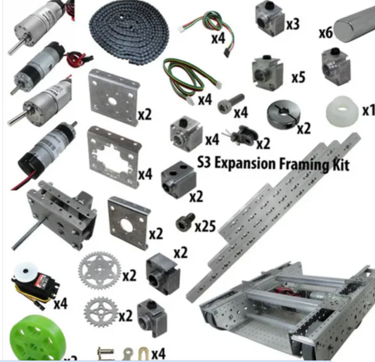 The FTC starter kit (with 6WD Tile Runner and S3 expansion kit) is compact in size and strong, making it perfect for FTC sized robots. The 16mm shape and hole spacing mean that the S3 system can connect with many other products in the larger FTC ecosystem of manufacturers such as Tetrix and REV Robotics to expand the functionality of existing components.