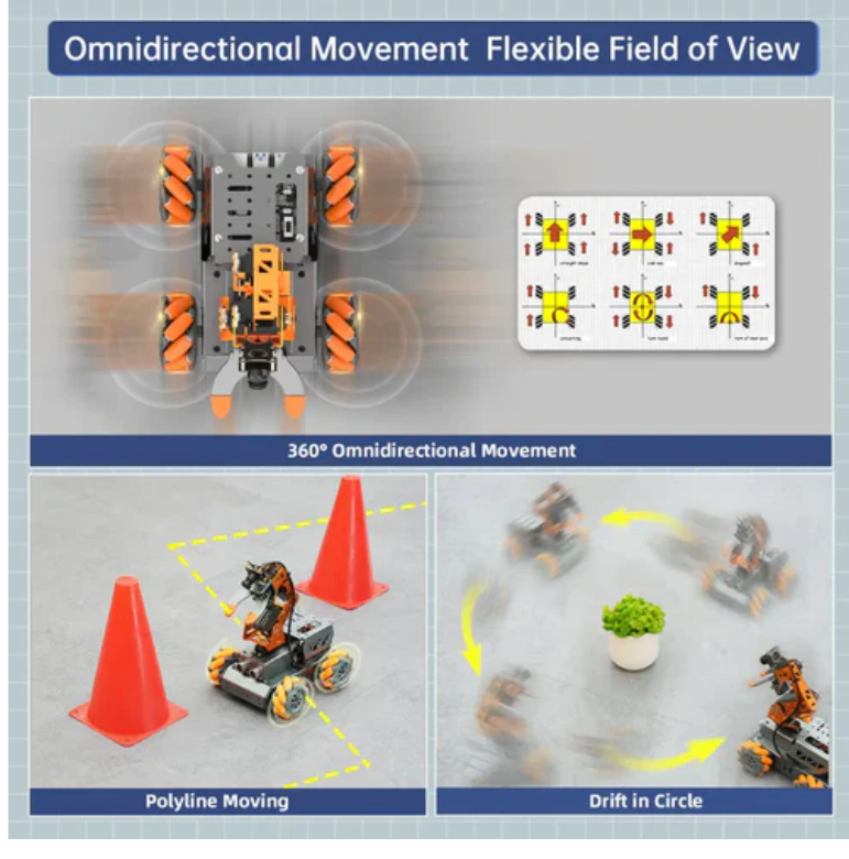The MasterPi is equipped with four universal Mecanum wheels that can rotate 360 °, with multiple motion modes (forward, horizontal, diagonal, rotation) and excellent performance, allowing it to challenge various complex routes.