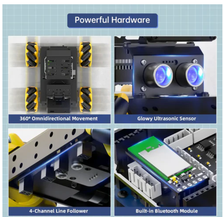 Distance measurement and obstacle avoidance - MiniAuto is equipped with luminescent ultrasonic sensors that can measure distance and emit various colors of light.