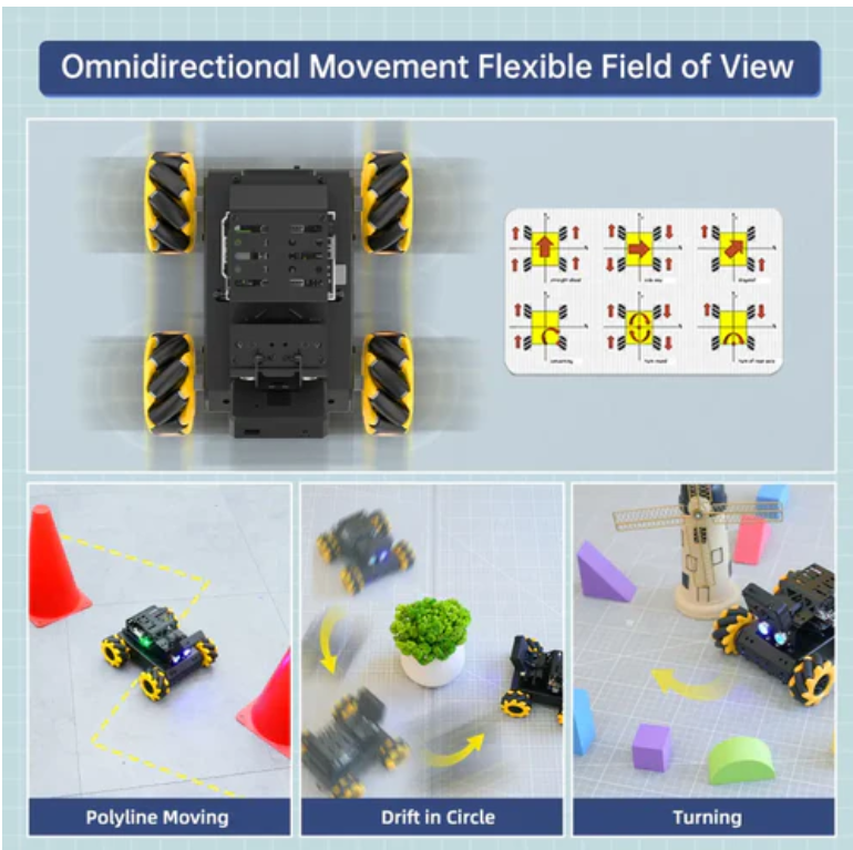 With the help of the Mecanum wheel, miniAuto can move in any direction, support various motion modes, and easily navigate complex surfaces.