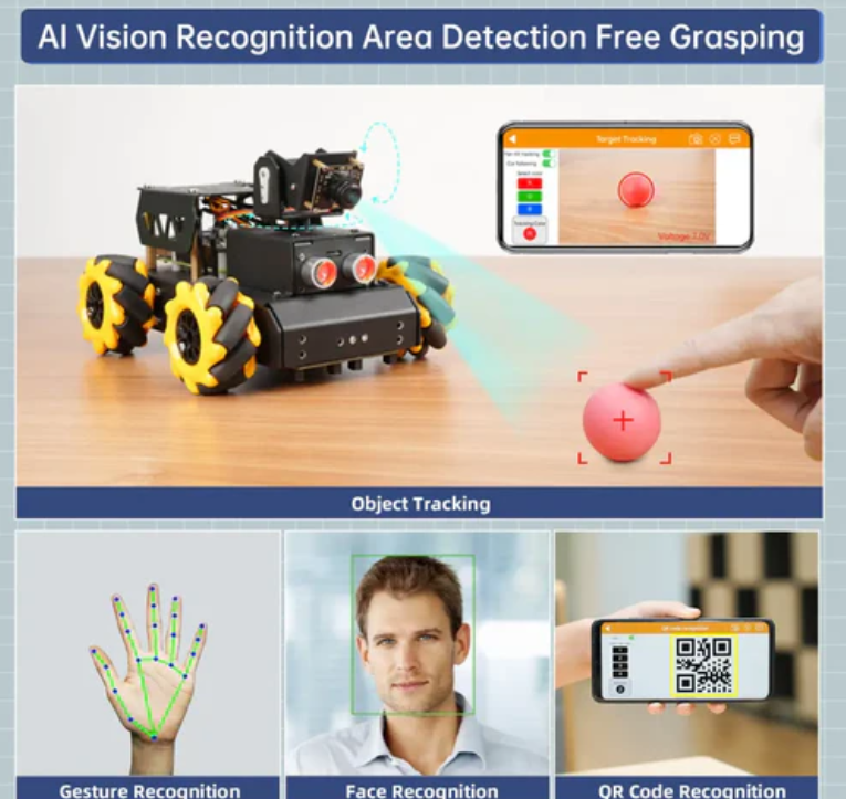 TurboPi uses OpenCV as an image processing library to recognize target objects and complete AI games such as face tracking, color tracking, QR code recognition, gesture recognition, object recognition, and line tracking.