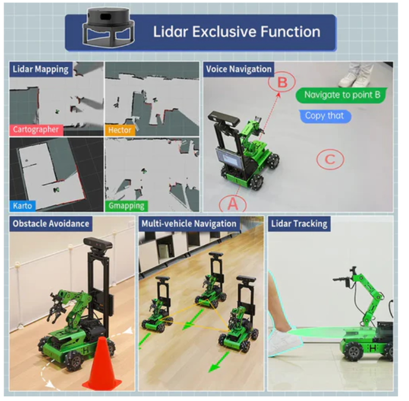 JetAuto Pro can achieve multi machine formation performances and artificial intelligence games through multi machine communication and navigation technology.