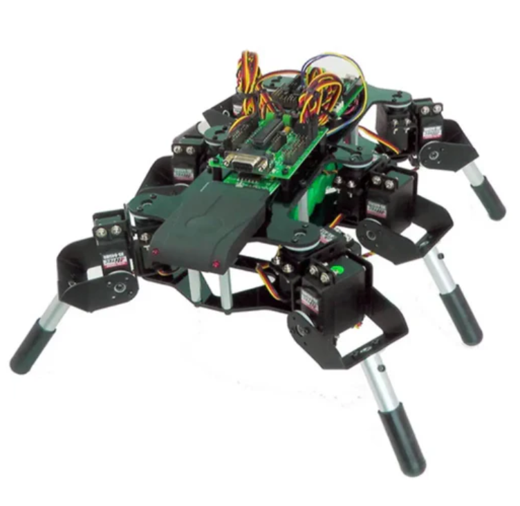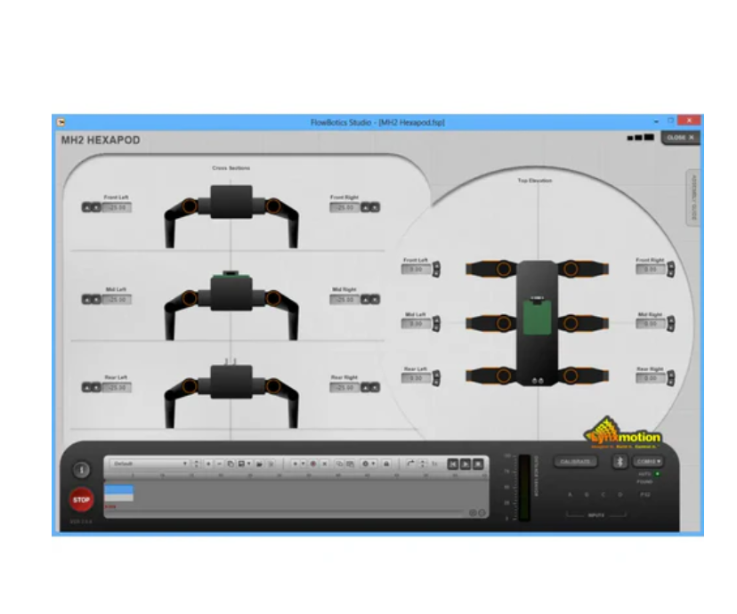 • The Lynx Mini Hex hexapod robot kit MH2F (FlowBotics Studio) is a multifunctional 12DoF hexapod walking robot. This kit includes the complete version of FlowBotics Studio, including SSC-32, serial to Bluetooth board, and Bluetooth module, which can be remotely controlled from a computer. This method transfers advanced computing to computers. FlowBotics Studio includes an MH2 demonstration project with pre written walking algorithms. The hexapod robot is designed around simple mechanical legs, with all metal brackets. This leg design minimizes the number of parts required to make two degrees of freedom (DOF) legs, allowing the robot to operate like a tank. Supports forward, reverse, and stationary turning. The robot's legs use standard sized Hitec servers. The combination kit includes everything needed to make a functional robot, except for the battery and optional PS2 controller. Mechanical structure hexapod