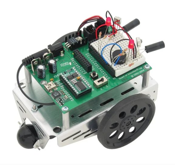 The Parallax Boe-Bot Robot Kit - USB Edition is a popular robot kit available for free using the USB compatible educational board (BOE). Programming the BASIC Stamp via USB is an effective solution for laptops and modern PCs that do not have a serial port (no additional adapters required). Instructions for installing the USB driver can be downloaded from the Helpful Links section. Hobbyists, educators, and students around the world have used over 90,000 Boe-Bot robots, providing a wealth of feedback to improve this popular kit.