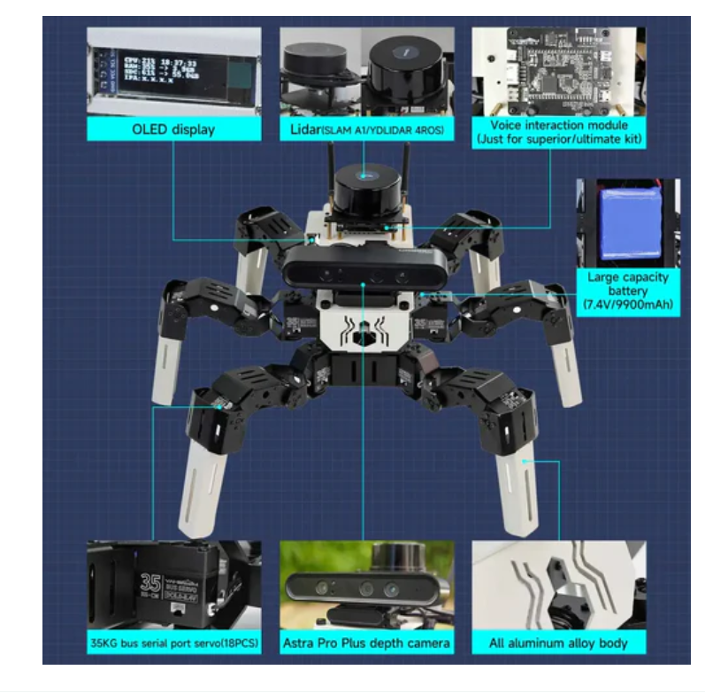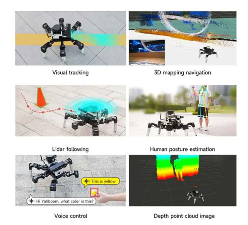 It is compatible with Raspberry Pi and Jetson NANO, and this is the Jetson version with the Jetson B01 board. It includes high-quality accessories such as 18PCS of 35KG metal bus servos, a depth camera, a LiDAR, a voice interaction module, and a large-capacity battery. It is programmed in Python3, uses the ROS2 operating system, and applies inverse kinematics algorithms to precisely control the movement of the robot. Yahboom provides a multifunctional remote control APP, a wireless controller, and a map navigation APP. It supports RVIZ simulation, allowing users to control the robot and verify algorithms in a virtual environment. Muto RS is a desktop-level bionic hexapod robot developed and designed based on the ROS2 operating system, which is compatible with both Jetson NANO and Raspberry Pi. The entire fuselage is made of aluminum alloy, and it contains 18PCS of 35KG serial bus servos, a depth camera, a LiDAR, and a voice module. Through Python3 programming and built-in high-precision algorithms, Muto RS can easily achieve AI visual interaction, 3D mapping and navigation, voice interaction, deep learning, and Rviz simulation. Based on multi-machine communication technology, we can also make Muto complete multi-machine synchronous control and multi-machine navigation. Users can control it through methods such as APP, wireless gamepad, and computer web pages. Muto is not only suitable for learning the algorithms of multi-legged bionic robot movement but also a good platform for ROS developers.