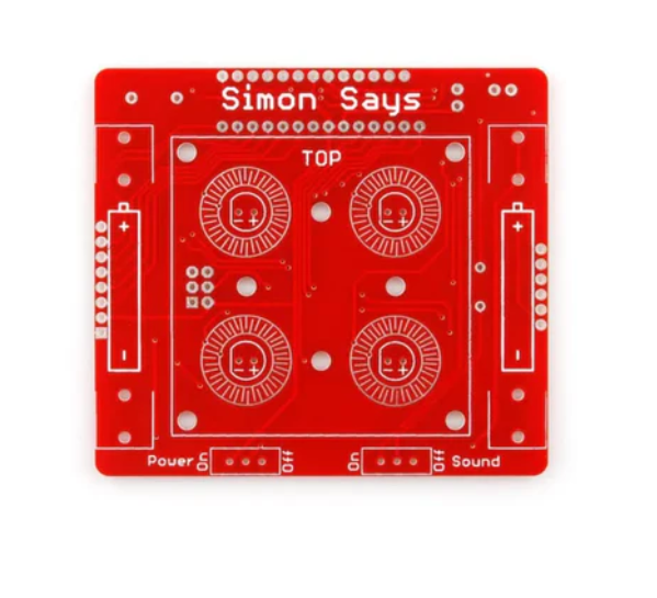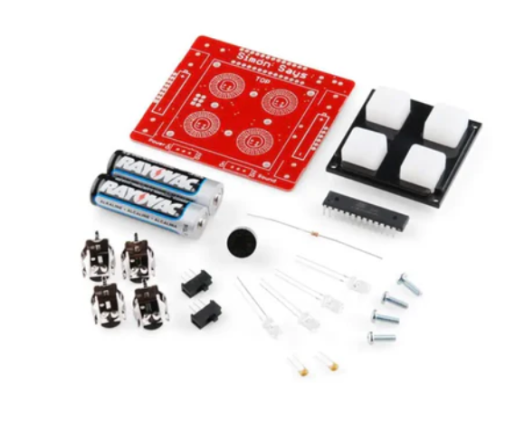 Simon Says - A few modifications made to the through-hole soldering kit make it easier for beginners to build. All components are through-hole, making this kit ideal for starting to learn soldering. When you build this kit, you will have the opportunity to solder a 28-pin microprocessor, LEDs, battery clips, and more.