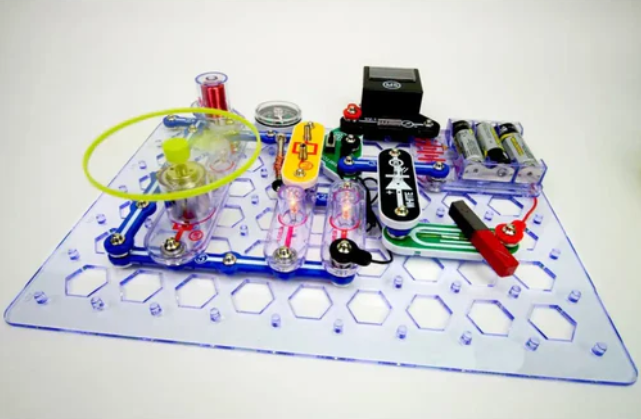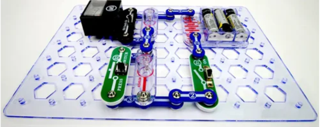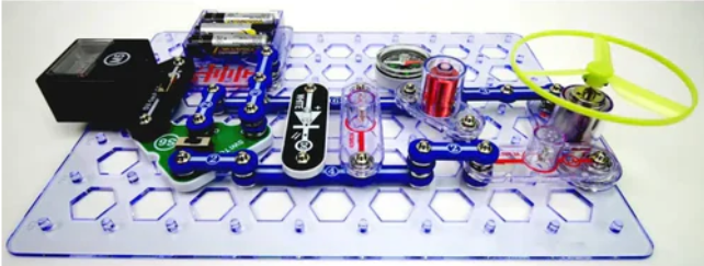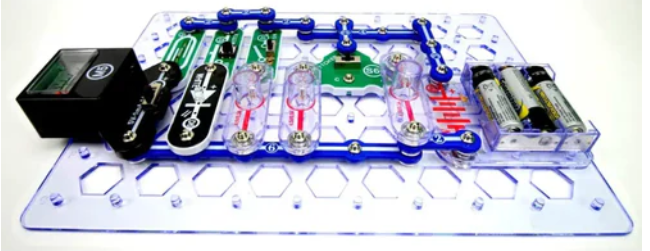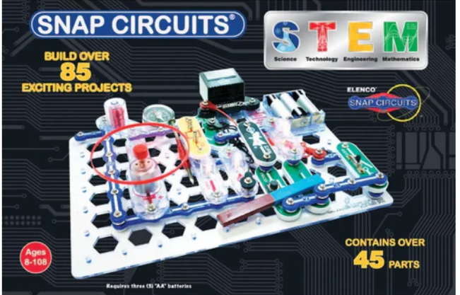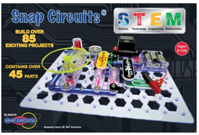 • The Snap Circuits STEM Kit uses snap-on building blocks to assemble different electronic circuits on a simple "row and column" base grid, which functions like a printed circuit board in most electronics. Each part can be easily identified by its different color and functional purpose. Learn about electricity and magnetism and how they relate to each other. This project will help students learn about magnetic fields, how electricity works in the home, and how switches control electricity for home lighting.