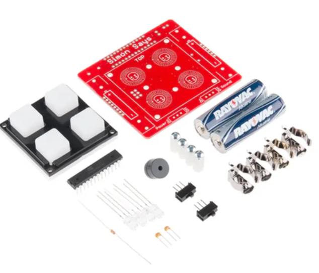 • SparkFun Learn to Solder - Simon Says is a great starter kit for those new to soldering and a fun interactive toy. The kit features through-hole components, making it a great starting point for learning soldering techniques. It includes a 28-pin microprocessor, LED, battery clip, and other basic components for a comprehensive hands-on experience.
