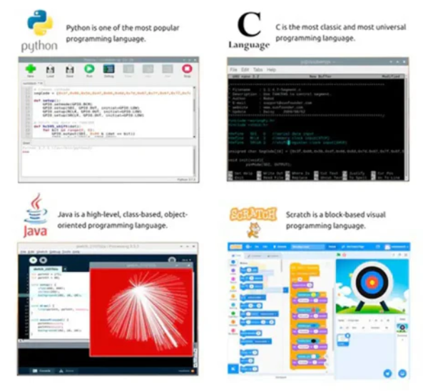 This is a Raspberry Pi starter kit compatible with the Raspberry Pi 400 4B/3B+/3B/3A+/2B/1B+/1A+/Zero W/Zero. It contains 300 components for learning electronics and application programming. The SunFounder Da Vinci Raspberry Pi Starter Kit contains four programming languages: Python, C, Scratch, Nodejs, and Java (Processing System).
