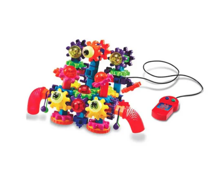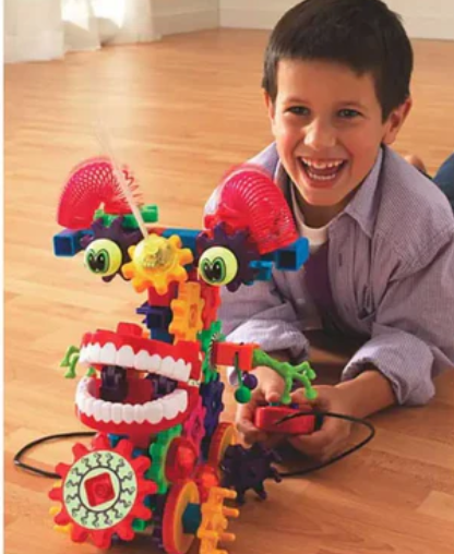 Gears! Gears! Gears! The electric Wacky Wigglers building kit includes 130 parts, including colored gears, springs, bite teeth, flashlights, whiskers, and luminous eyeballs, for endless creative combinations.