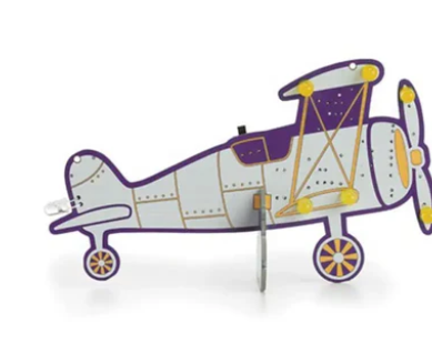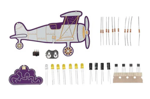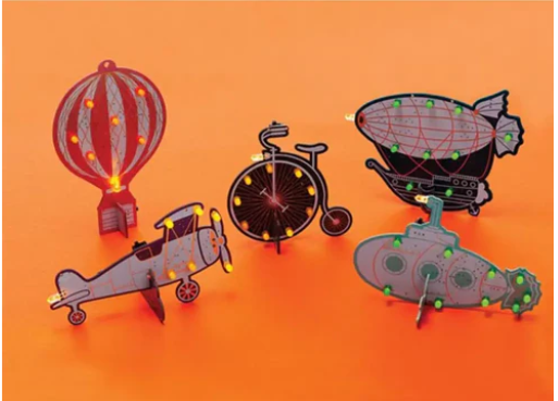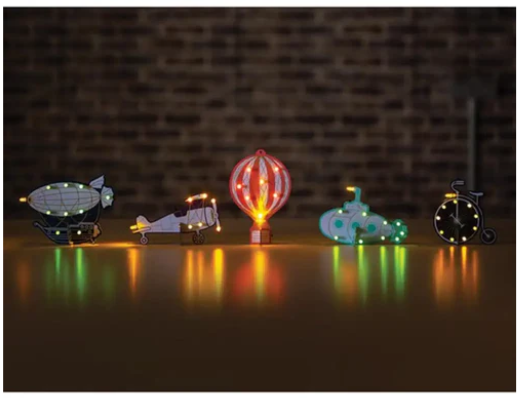 • The second kit features a Jules Verne-style biplane, with a small mounting hole on the top, and can be hung, or stand alone. It features a unique purple print with multiple yellow LED lights and a warm candle-like flickering LED light at the tail.