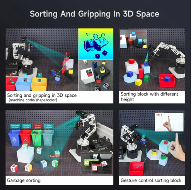 Combined with high-performance 3D depth cameras, DOFBOT-PRO can not only achieve environmental perception, object recognition, and other functions, but also accurately locate three-dimensional space based on target RGB data, position coordinates, and depth information. Combined with RGB+D fusion detection, it can complete complex visual recognition and grasping tasks.