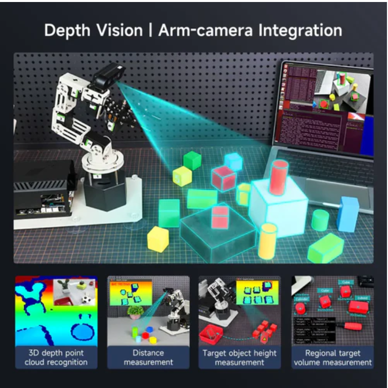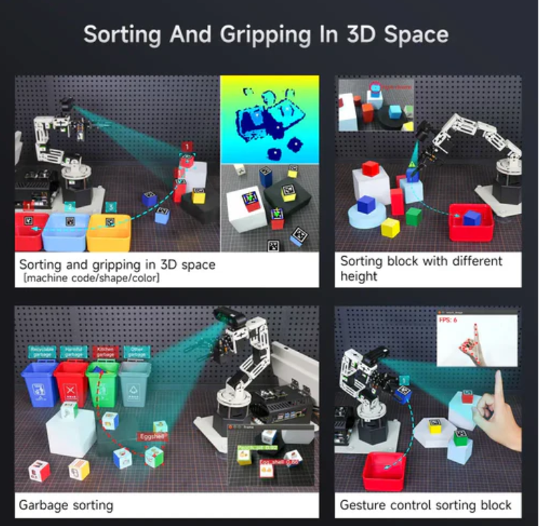 Combined with high-performance 3D depth cameras, DOFBOT-PRO can not only achieve environmental perception, object recognition, and other functions, but also accurately locate three-dimensional space based on target RGB data, position coordinates, and depth information. Combined with RGB+D fusion detection, it can complete complex visual recognition and grasping tasks.