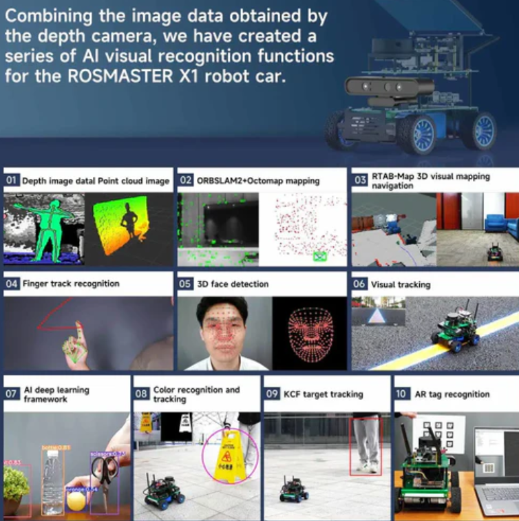 1. The multifunctional expansion board, combined with accessories such as radar, depth camera, and voice module, can achieve various interesting gameplay for robots. For example, technology intelligent games such as path planning, radar obstacle avoidance and tracking, 3D visual mapping and navigation, AI visual recognition and tracking, multi vehicle control, voice remote control, etc