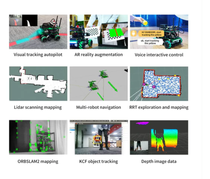 ROSMASRER X3 is equipped with a depth camera, LiDAR, and voice interaction module, which can realize ROS operating system, RTAB 3D mapping navigation, PCL 3D point cloud, SLAM mapping navigation, machine vision applications, voice interaction control, Python programming, STM32 development, MediaPipe development, YOLO model training, TensorRT acceleration (note: different versions have different functions).