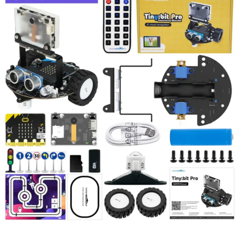 Tinybit Pro is a popular combination of Yahboom Tiny: bit car and K210 vision module. The car itself integrates various components such as infrared sensors, ultrasonic modules, sound sensors, buzzers, etc. Users can use MakeCode graphical programming to achieve interesting functions such as obstacle avoidance, following, singing, etc. With the K210 module, Tinybit Pro can capture high-definition images and achieve machine learning, image recognition, color detection, target tracking and other functions.