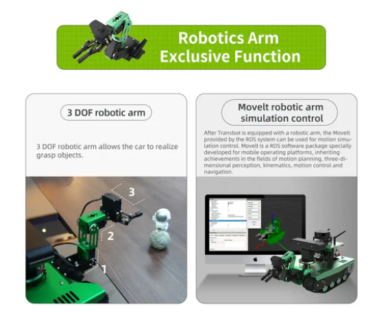 The whole vehicle is made of green aluminum alloy oxidation material, and supports the installation of robotic arms, 2DOF camera gimbals, 7-inch screens, etc.